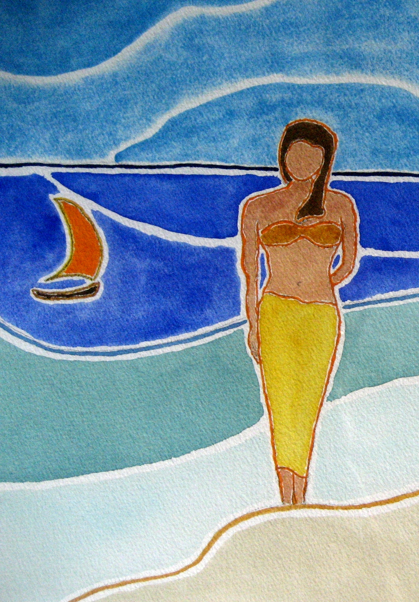 I’d been looking at a collection of Tahitian paintings by Paul Gauguin when I put brush to paper one morning and imagined this seaside scene. But its statuesque female figure is more abstracted (without defined facial features) in the style of Post-Impressionist Maurice Prendergast, one of the great American watercolorists of the last century and a favorite of mine.