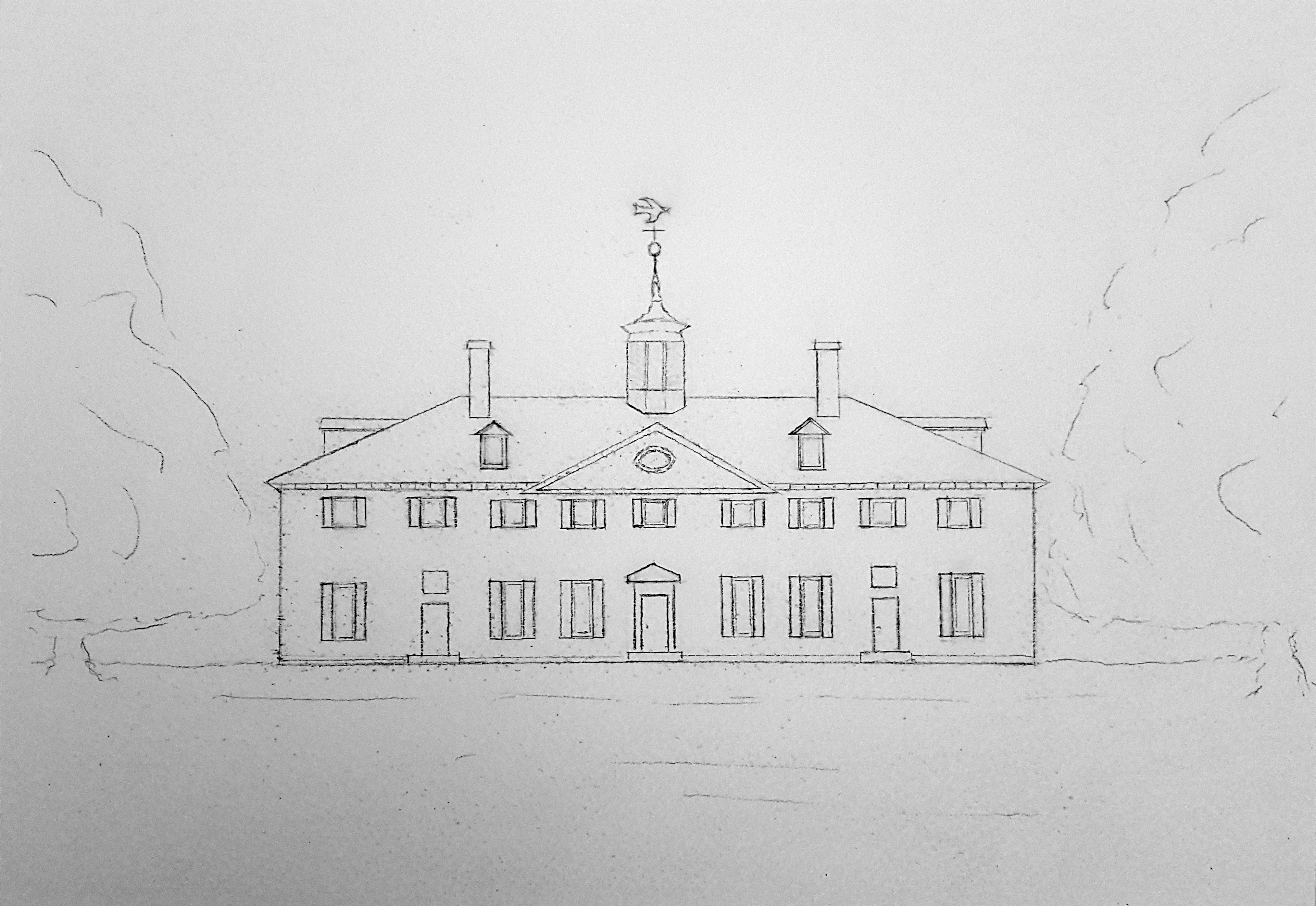 I made this spartan sketch in preparation for a watercolor painting of General Washington’s legendary home at Mount Vernon, Virginia. It reflects an earlier phase of the mansion’s history, circa 1770, prior to the construction of the adjoining colonnades and circular forecourt that you’d see on a visit there today.